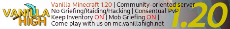 Server updated to 1.20.4 Vanilla High, your build-focused/community-oriented Keep Inventory Vanilla server. We dont allow griefing/raiding and unwarranted PvP. We also require of players a maximum effort to keep the server atmosphere family-friendly. Vanilla High is a server that tolerates languages other than English. KeepInventory: ON TPA: OFF Fire Spread: OFF Mob Grief: ON World Border: 40K Difficulty: Hard Hacks/Cheats: Not allowed Duping: Not allowed Optifine is allowed and encouraged Minimap is tolerated as a purely navigational aid. Nether roof travel: allowed.