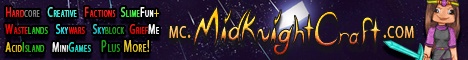 Welcome to MidKnightCraft! This is your one stop for many different Minecraft servers which include Survival Multi Player, Creative, and Hard Core. We also have unique servers like GriefMe; where you can build and distroy builds to your liking. We also have mini game servers like Skyblock, AcidIsland, as well as Skywars. We love to feature custom builds for mini games and servers a like. So why not come join us for some fun and games?