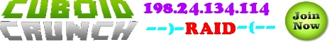 Greetings! Cuboid Crunch is a multi-server community. We feature Creative, Role-Play, and a Raid server. Joining each server is simple. Right-Click the item in your hand, and then click the icon for the server For instance, click the TNT, to go to the Raid server. On Raid, Griefing, Stealing, PvP, etc are all allowed! We do ask that you keep swearing and caps to a minimum, although they are allowed. All staff positions are taken, although we do need players! So invite your friends; even your enemies. Have Fun!