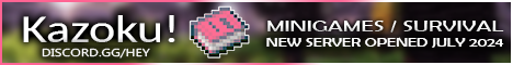 Kazoku! is a Minecraft server that just opened in July 2024. So you'll be on an equal playing field as everyone else as you begin your adventure with us! Cozy active Discord, Minigames, Survival 1.20.4/1.21, Plots, Economy, custom mobs and boss fights, New features being added every day.