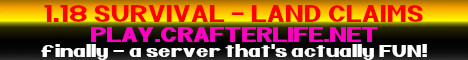 You are dead. WHAT? Yes, I know it's shocking to us as well, but you are dead. HOW? You should be more careful when crossing the road. Truck-kun is everywhere. You wake up in a place with ultimate freedom! Endless exploration! This is your Crafting Afterlife. Welcome, to CrafterLife. CrafterLife is a NO-LAG fun server with friendly players! We don't police the players here, we believe you can take care of yourselves with the right tools. Protect your land from being griefed with land claims. Someone said something you don't like? Ignore them with /ignore ! We hope you're as excited to be here as we are to have you. Enjoy your stay!