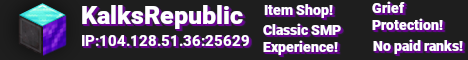 Want to play on a new Minecraft server without having to worry about it being shut down? Then Join "Kalks Republic"! The server was launched in 2019 and has been up ever since! The server is a basic SMP server with plugins to enhance your Minecraft experience. You won't have to worry about griefers! Build-in peace! We also have server ranks that are similar to the early days of Minecraft. You start off as a "newbie" then after a few hours of playing you get to progress to "Builder" and after that, you have a chance to become staff on the server! All ranks on this server are earned! Server IP: 104.128.51.36:25629 Discord: https://discord.gg/awRYYBg If you have any questions at all you can reach out to me here or on discord!