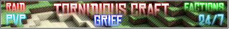 Plugins -------------- Factions/Essentials/Groupmanager Ishout/MyWolf/Emotions/Vault/Gates AutoAnnouncer/ColourFireWorks/Seats What we can do for you? We can make sure you have the best time ever on are server.We have factions.Which means griefing is allowed We can not stop griefing and raiding.We will try to make sure people dont abuse you And we will try make you have fun on the server. Here on tornidiouscraft we hope you have the best time.With factions and essentials.You can do anything.Anything is possiable