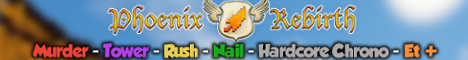 Phoenix-Rebirth est un serveur français en version 1.10/1.11/1.12/1.13 vous proposant de nombreuses Maps PvP connues. Vous pourrez trouver sur le serveur du Murder, du Tower, du Rush, du Nail, du HardCore Chrono, du MonsterIndustrie, du Pile Of Bodies, du CubeControl, du Skywars UHC ainsi que des jeux plus personnalisés comme du TwiceBuild ou du Diablock. Les systèmes d’amis et de groupes sont présents sur le serveur, vous pouvez donc facilement rentrer dans des parties avec vos amis. DERNIÈRES NOUVEAUTÉS SUR LE SERVEUR : _ Nouveau Jeu : Murder Kit _ Nouvelle Map Murder _ Compatibilité 1.13 Nous espérons vous voir bientôt sur le serveur. :) IP : mc.phoenixr.fr