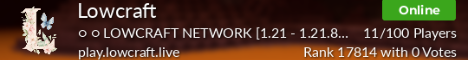 Hola, los esperamos en Lowcraft para una experiencia survival un poco diferente a lo que estan acostumbrados, survival con estructuras custom, contamos con koth para demostrar tu supremacia en el pvp.